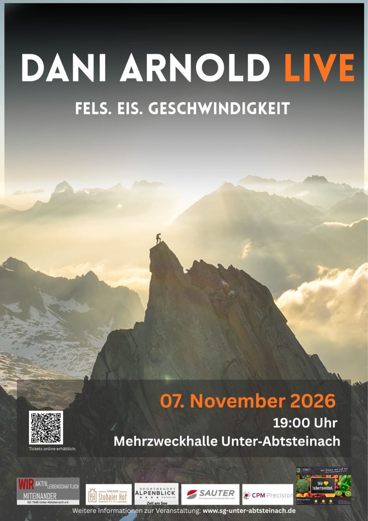 Erleben Sie einen Abend voller Adrenalin, Leidenschaft und spektakulärer Geschichten aus den höchsten und gefährlichsten Bergen der Welt. Dani Arnold, einer der bekanntesten Extrembergsteiger unserer Zeit, nimmt Sie mit auf seine außergewöhnlichen Expeditionen: atemberaubende Speed und Solo-Besteigungen, Grenzerfahrungen in eisiger Höhe und Momente, in denen jede Entscheidung über Erfolg oder Scheitern entscheidet.